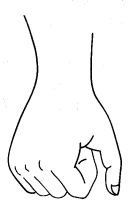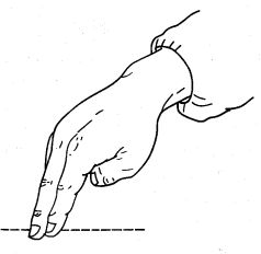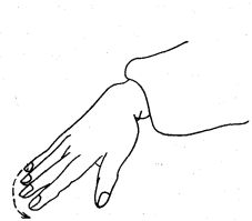 [手法要领] 术者手握空拳,拇指自然伸直,并盖住拳眼(使拇指对着食指笫二节处),用拇指端或罗纹面着力于治疗部位。沉肩、垂肘、悬腕,运用腕部的往返摆动,带动拇指间关节的屈伸运动,使所产生的力轻重交替,持续不断地作用于治疗部位。频率每分钟120~160次(图)。