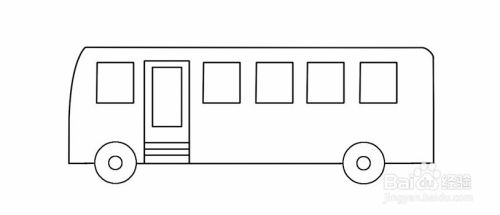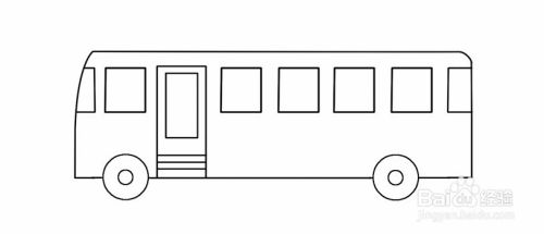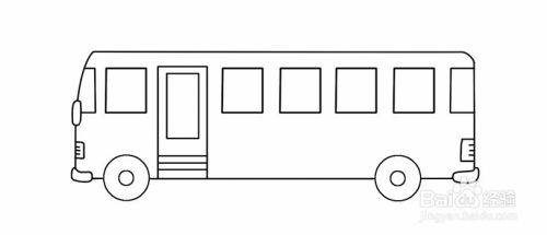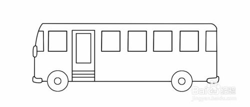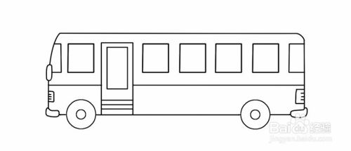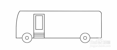 接着,在靠左边的车轮画公共汽车的门,接着底盘往上画类似长方形的轮廓,再添加一个长方形做门的玻璃视窗,再在门下方添加纹理线。