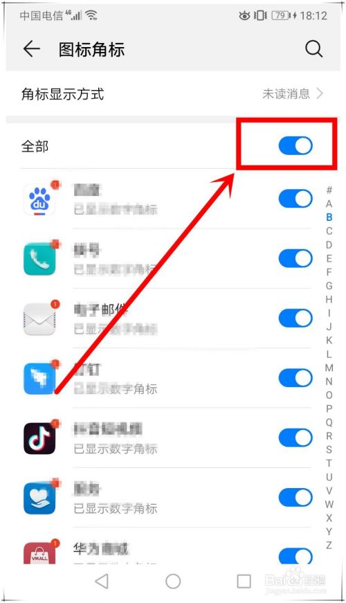 然后,在图标角标页面,点击“全部”后面的开关,关闭全部应用的角标显示。