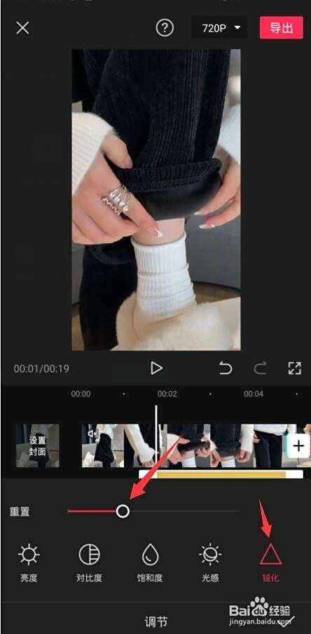 打开剪映APP,导入视频后,点击调节,点击对比度,调大数值,点击锐化,拉大锐化的数值,视频变清晰。
