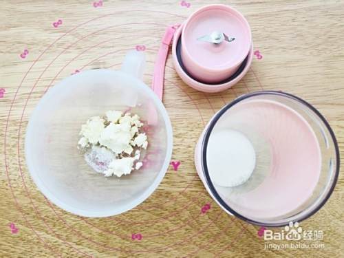准备来做奶盖部分。奶酪和牛奶还有海盐,这三个材料一起放到果汁机里搅打均匀。