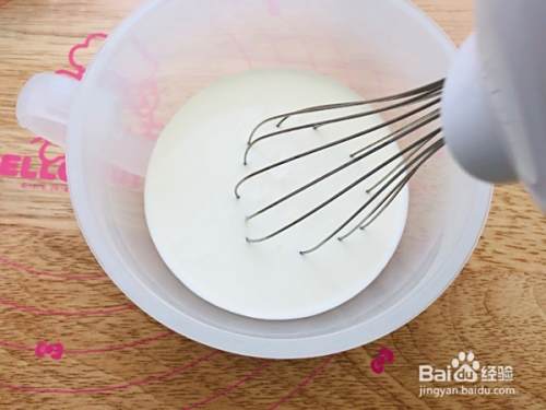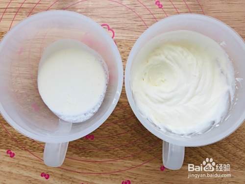 将淡奶油打到5分稍微凝固的状态即可,大概看到奶油从稀到稠就行,不要打到硬挺哦!假如真的一不小心打过了,可以加入液体淡奶油再调和一下,最后把110g的奶油的量称出来就可以了哦!