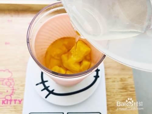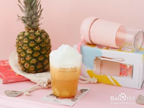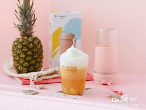材料称好以后开启机器,搅打均匀。 将水果茶倒到杯中,加上刚刚做好的奶盖就好了。