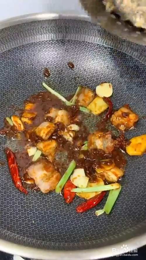 锅烧油下五花肉八角,葱姜蒜干辣椒,豆瓣酱炒香,下鱼