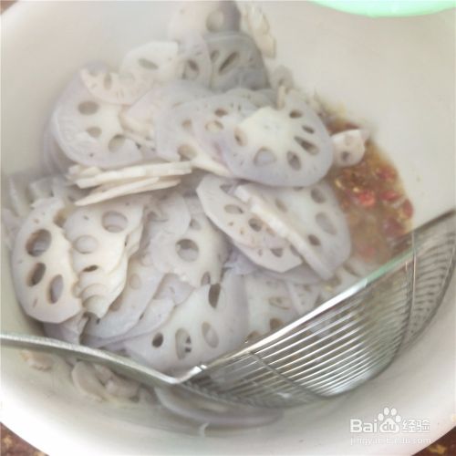 拌菜:在热锅中捞出藕片直接放入调好的底料盆中(不用浸凉水),赶紧搅拌均匀。如果藕太多分多次煮也没有关系,但每次捞出来放到盆里的时候都要搅拌。