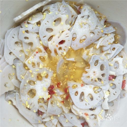 调底料2:加入鸡精、糖,倒入香油,香油为了提高香味,但不可放入过多,否则,藕的口感油腻。至此,底料调好备用,里面辣椒、姜末、糖、醋、盐都非常重要。