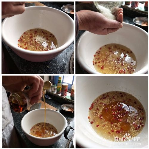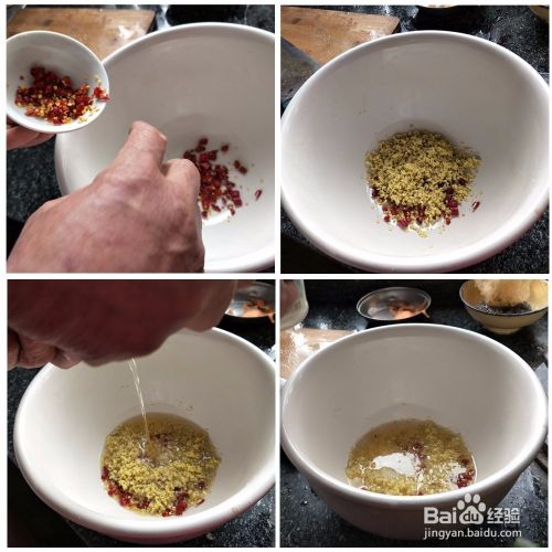 调底料1:准备干净的盆(本次做的比较多,用盆来乘),将切好的碎辣椒、姜末放入盆中,辣椒根据喜好放入适量。倒入白醋,加入盐。