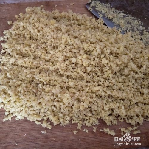 准备辅料:将生姜和辣椒切沫备用。尽量切碎,方便调料入味,且美观。大多数的超市买来的生姜较大,发白,切开后里面的姜丝较少,这类生姜味道淡,可以多放些,此次使用的是小黄生姜,味儿大,丝儿多。