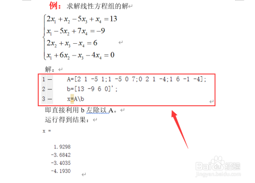 第二步、以下图中所示线性方程组为例,利用左除法直接求解线性方程组的解。x=A\b