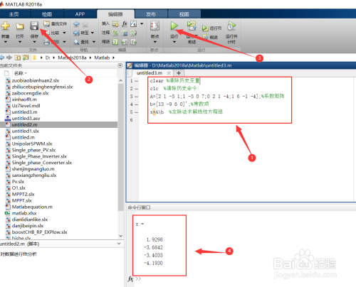 第三步、在新建的脚本文件中输入下图所示求解程序-->点击保存-->点击运行-->即可在命令窗口看到求解结果