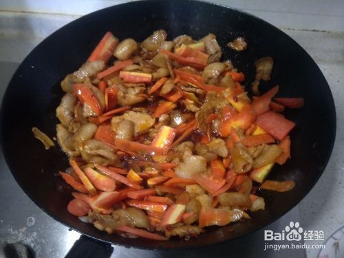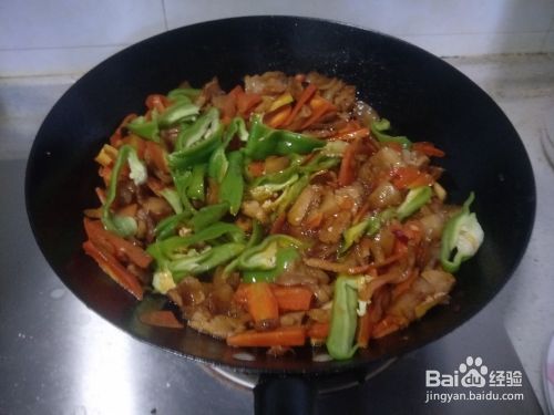 然后依次加入胡萝卜,青椒,翻炒均匀。