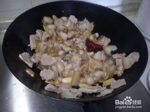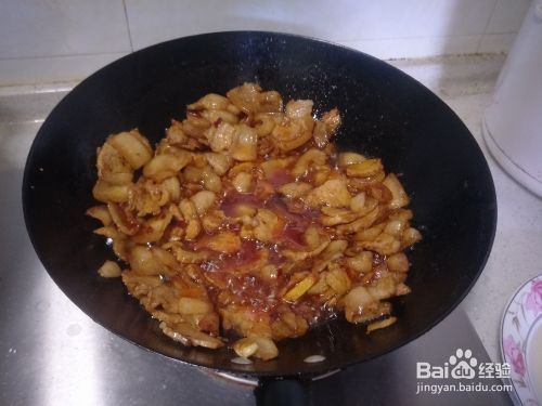 等肉片微微卷翘,可以加入配料,花椒,姜片,大蒜。然后放适量的豆瓣,快速翻炒均匀,肉片的颜色立马就出来了。炒一会儿,加入适量的生抽,再翻炒均匀。肉片的颜色就越来越深了。