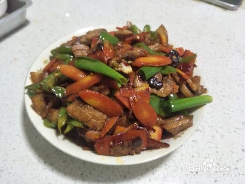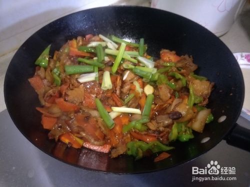 等青椒和胡萝卜熟得差不多了,最后关火加入葱段。食用盐根本就不需要啦,豆瓣本来就比较咸,放两勺豆瓣,如果还加盐,就会很咸。如果觉得咸味不够,可以在出锅前加一些。