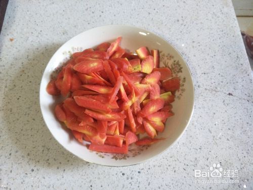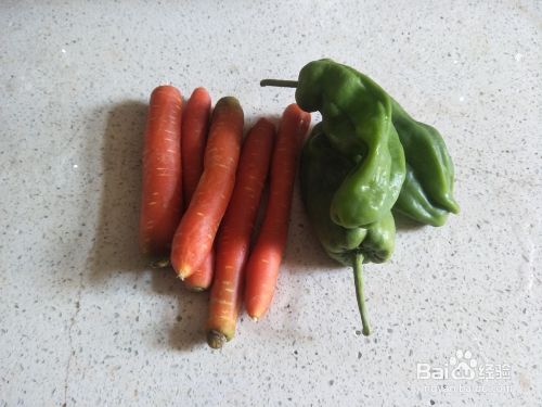 首相把素菜胡萝卜和青椒洗干净,胡萝卜切片,青椒切块状或者丝,不要切太细,不然一炒久没有了。分别装盘备用。