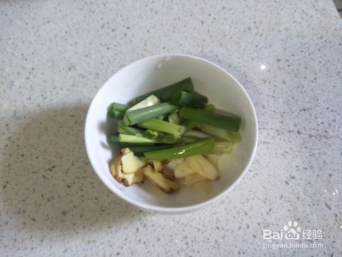 老姜切片,大蒜拍散去皮,随意剁几下,把准备好的配料装碗里备用。