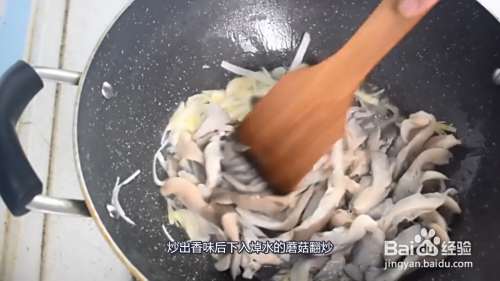 炒出香味后下入焯水的蘑菇翻炒,然后把火调成中小火,不停的翻炒蘑菇。