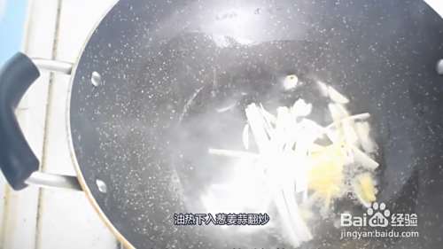 大葱切成丝,生姜切丝,大蒜切片,锅中加入适量的油,油热下入葱姜蒜翻炒。