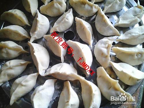 把粘好面粉的饺子,一个一个的摆放在合适的位置,如下面图片中所示。
