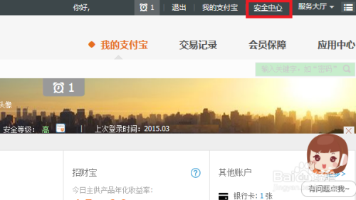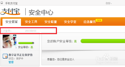 点击页面右上角的“安全中心”,在新标签中打开了如图支付宝安全中心,在安全管家下可见上次登录的地点和具体时间;