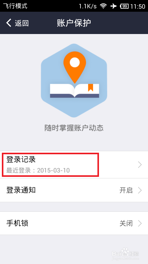 可见登录记录,以及设置手机锁和开启登录通知项,点击登录记录查看近期登录详情,以便随时掌握账号安全动态。