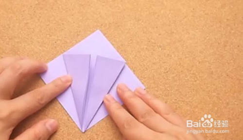 然后,将上半片的右下部分拉到中线,折起;左下部分也同样操作。折成如图所示。