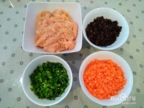 鸡胸肉洗净后,剁成鸡肉泥。黑木耳用热水泡发后,剁成碎末。胡萝卜去皮后,剁成碎末。香葱洗净后,剪成葱花。