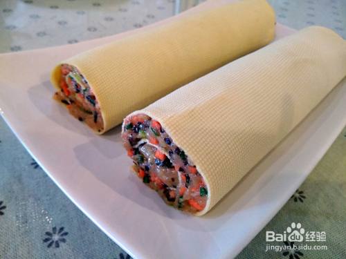 将抹好肉末的豆皮卷起来,尽量卷得紧一些,卷好后放入盘中。 。