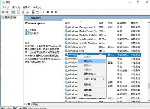进入服务界面,找到Windows update服务,右键点击,选择停止