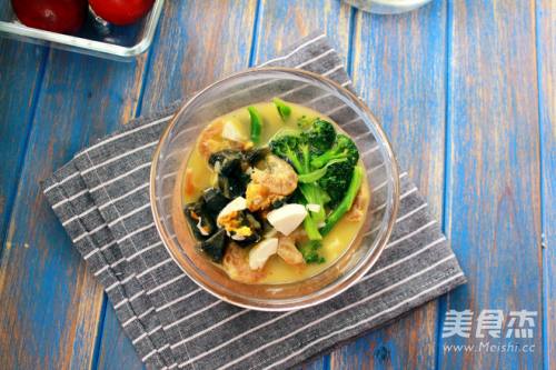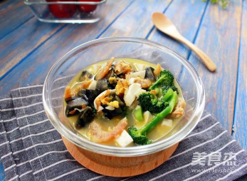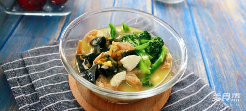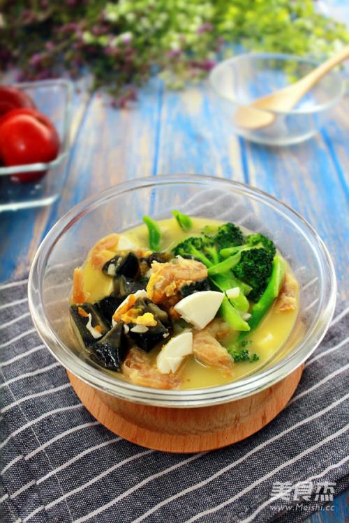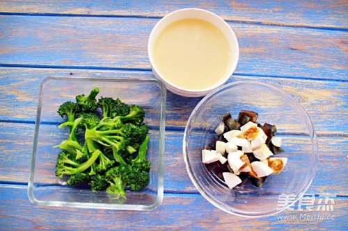 2油盐水焯烫西兰花,虾干加蒜末煸炒,加2碗水煮出奶白高汤。松花蛋,咸鸭蛋切丁。