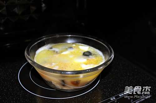 3把提前煮出来的热高汤跟松花蛋咸鸭蛋混合搅匀。