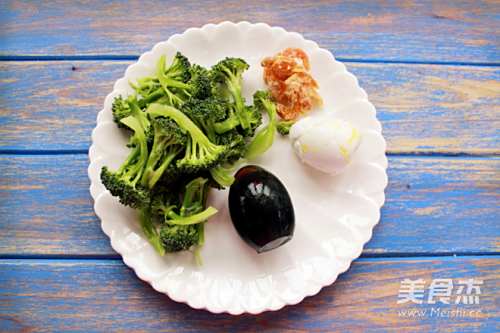 1西兰花改刀,盐水浸泡去农残。松花蛋咸鸭蛋剥壳备用,虾干剥壳