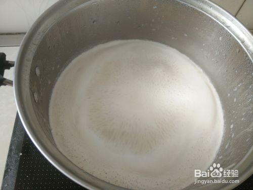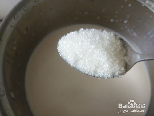 把适量的白糖放到花生奶里搅拌至融化完,然后开小火把花生奶煮沸。