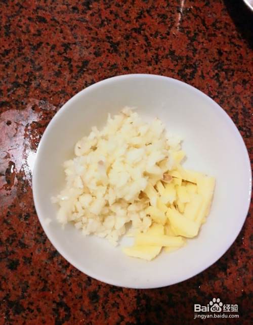 2、准备蒜蓉跟姜丝放入碗中,备用。