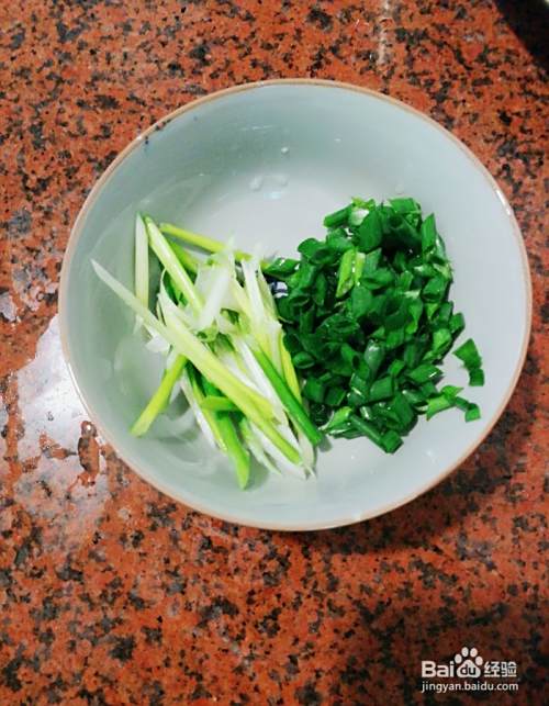 3、两棵小葱,葱白跟葱叶分开切,葱白切成丝,葱叶切成花。