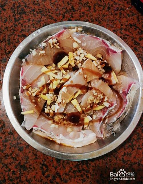 4、鱼腩开始调料,加入适量酱油,耗油,花生油,盐粉,再加入蒜蓉姜丝,拌匀。