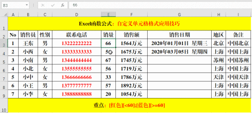 六、自定义单元格格式:根据不同的范围显示自动填充颜色。