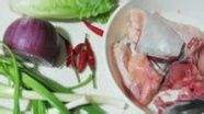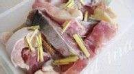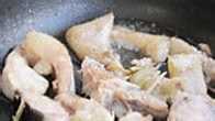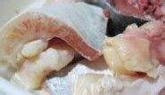 芒鱼腩洗净切成大块,可以看到鱼腩中须瘦相间,更有一大块淡黄鱼的鱼油。
