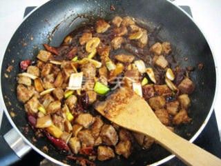 2、猪肉不易炒熟,炒的时候可以多加些油,用半炸的方式使其成熟。我用了省油的办法,就是炒制过程中 加入少许水,盖锅盖焖一下,这样会加速成熟而且口感不柴
