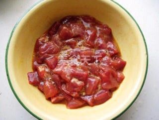 1、猪肉切1厘米的丁,用酱油、料酒、少许鸡蛋、淀粉、小苏打抓匀,腌制半小时。