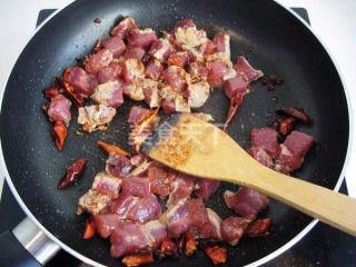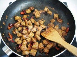 5、放入腌好的肉丁翻炒,加入辣椒面,继续翻炒