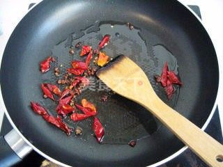 4、锅中热油,放干辣椒段和花椒炸至颜色变深。