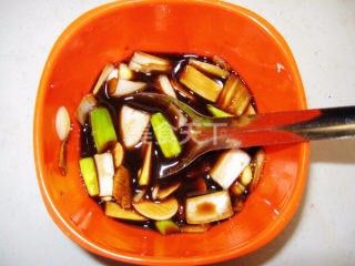 2、葱姜蒜切指甲大的片,加入酱油两汤匙、醋三汤匙(一勺陈醋两勺米醋)、糖两茶匙、料酒一汤匙、盐一茶匙、蚝油少许和淀粉调匀成碗汁