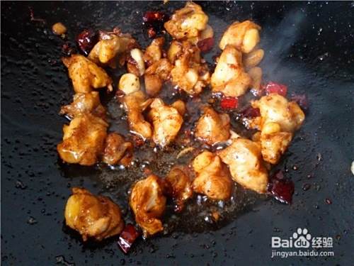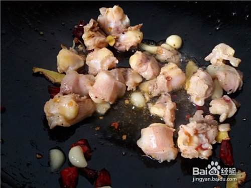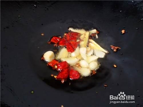 锅中放油,先加入花椒粒炒出香味,再加入姜片、蒜片和干红辣椒段炒出香味。