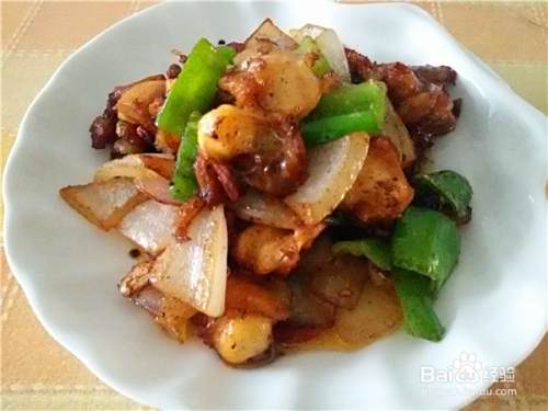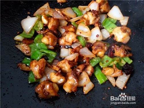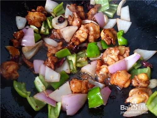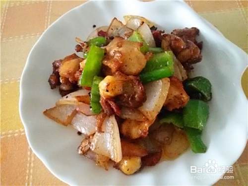 加入洋葱和青椒片,调入适量的白糖、盐和醋,大火翻炒均匀即可出锅。
