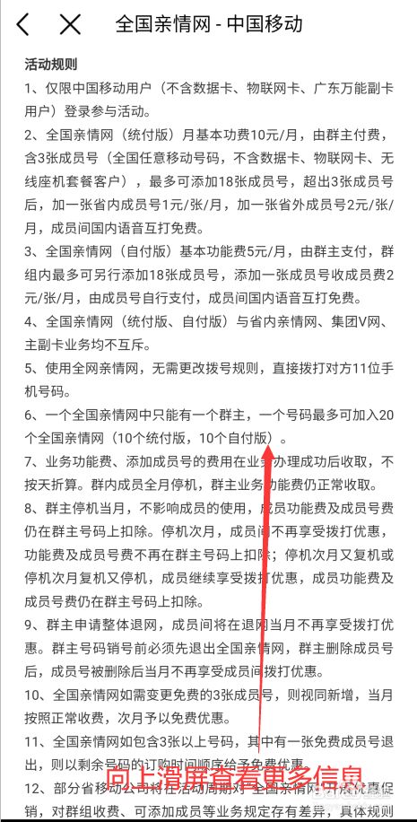 操作完第5步后,即可查看到亲情网收费规则。如:全国亲情网(统付版)月基本功费10元/月,由群主付费,含3张成员号。超出部分省内每张卡1元/月,省外每张卡2元/月等。见下图