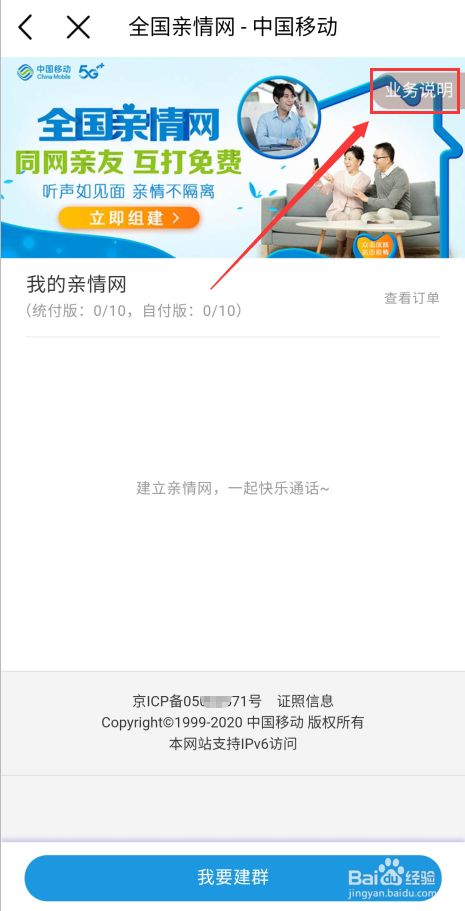 进入“全国亲情网-中国移动”页面后,点击右上方的“业务说明”即可。见下图