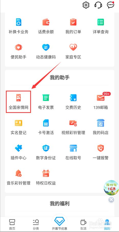 在“我的”页面,往上滑动屏幕直到找到“我的助手”下的“全国亲情网”。见下图