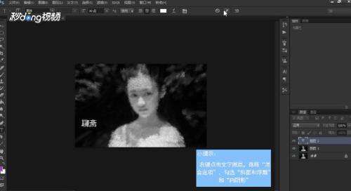 4点击“T”添加文字,并且右键点击文字图层,选择“混合选项”,勾选“斜面和浮雕”和“内阴影”即可。END