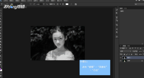 2依次点击滤镜、模糊、高斯模糊。设置好合适的半径,点击确定。点击图像、调整、去色,将图片设置为黑白色。