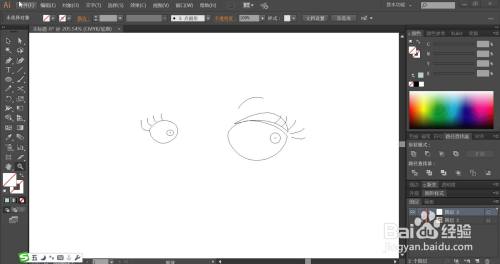 使用钢笔画出女孩的左侧与右侧的眼晴,我们画大右侧眼晴,从而产生一种转脸瞪眼的效果,眼睫毛使用钢笔用线条画出,设置线条的宽度在6点左右。
